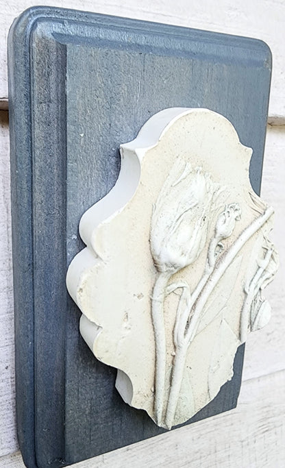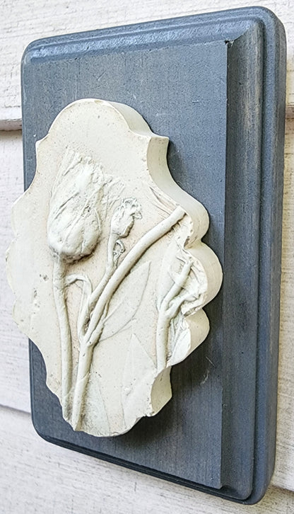 This vintage shaped plaster cast features the bas relief of Lisianthus flowers tinted in blue. The cast is sealed with matte acrylic varnish. The cast is mounted on a blue-gray stained wood plaque with a matte finish. There is a sawtooth hanger on the back.