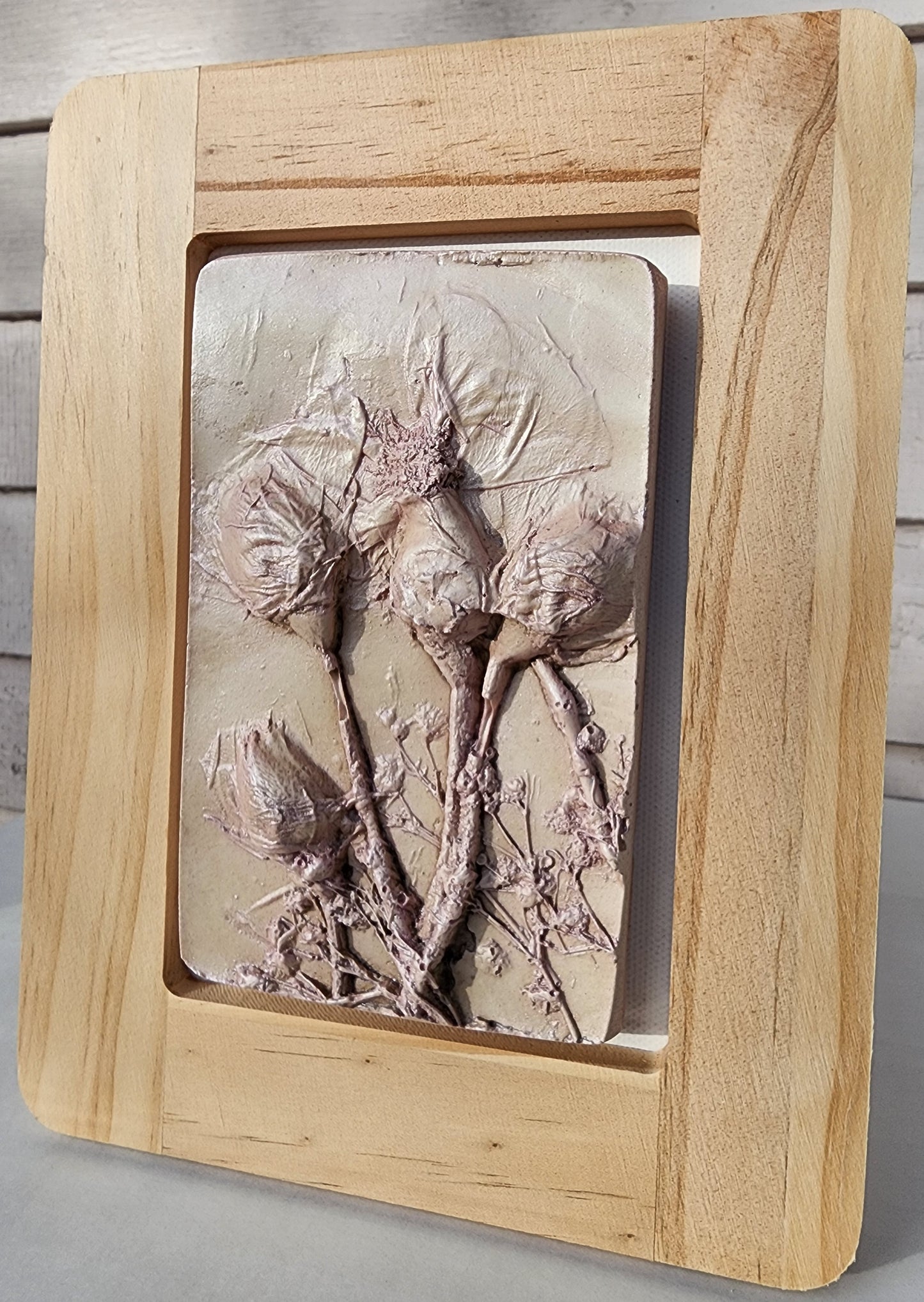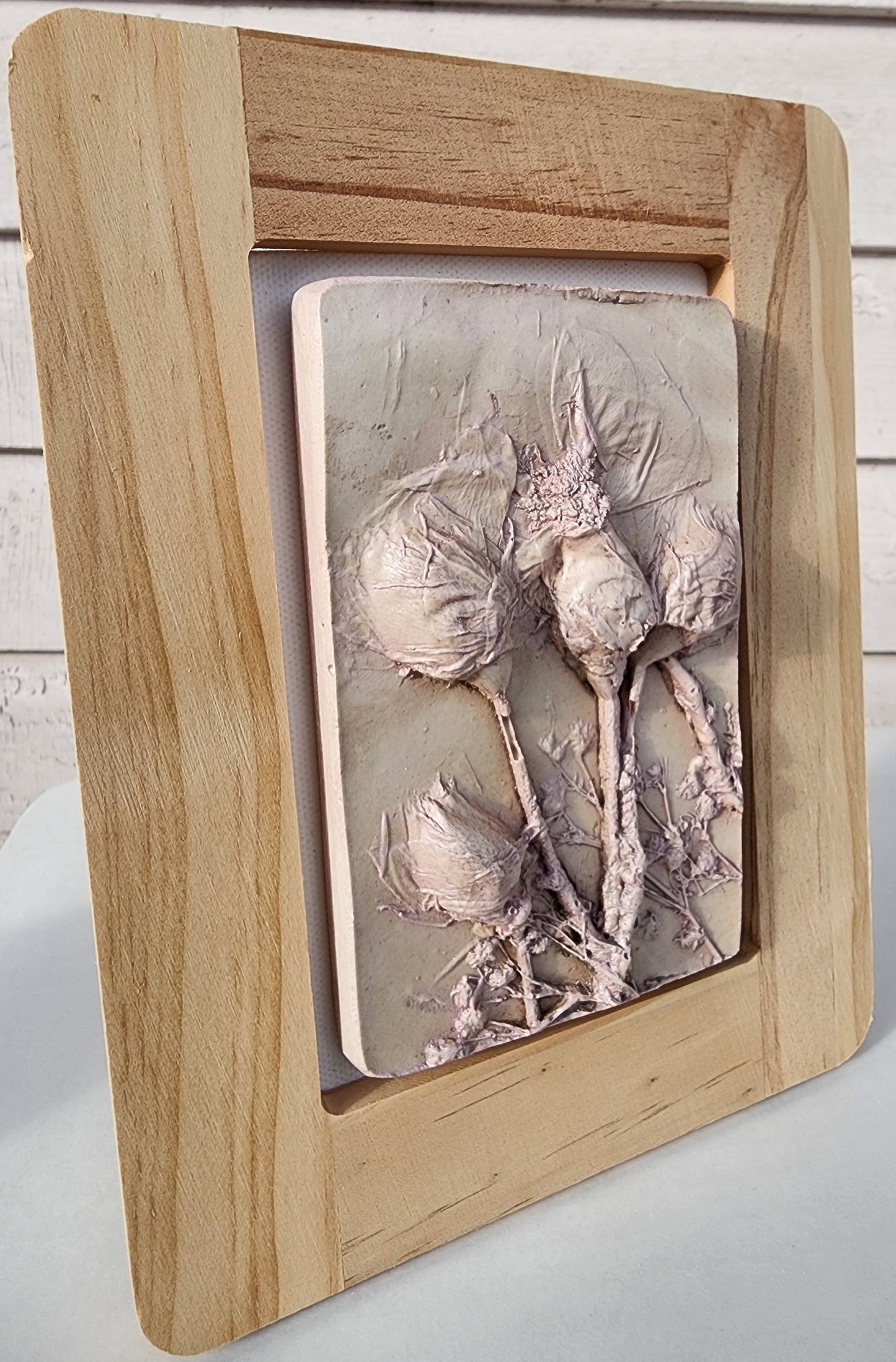 This plaster cast features bas relief of roses tinted with pink mica shimmer dust. The cast is mounted in a wood frame that can be hung or can stand alone.