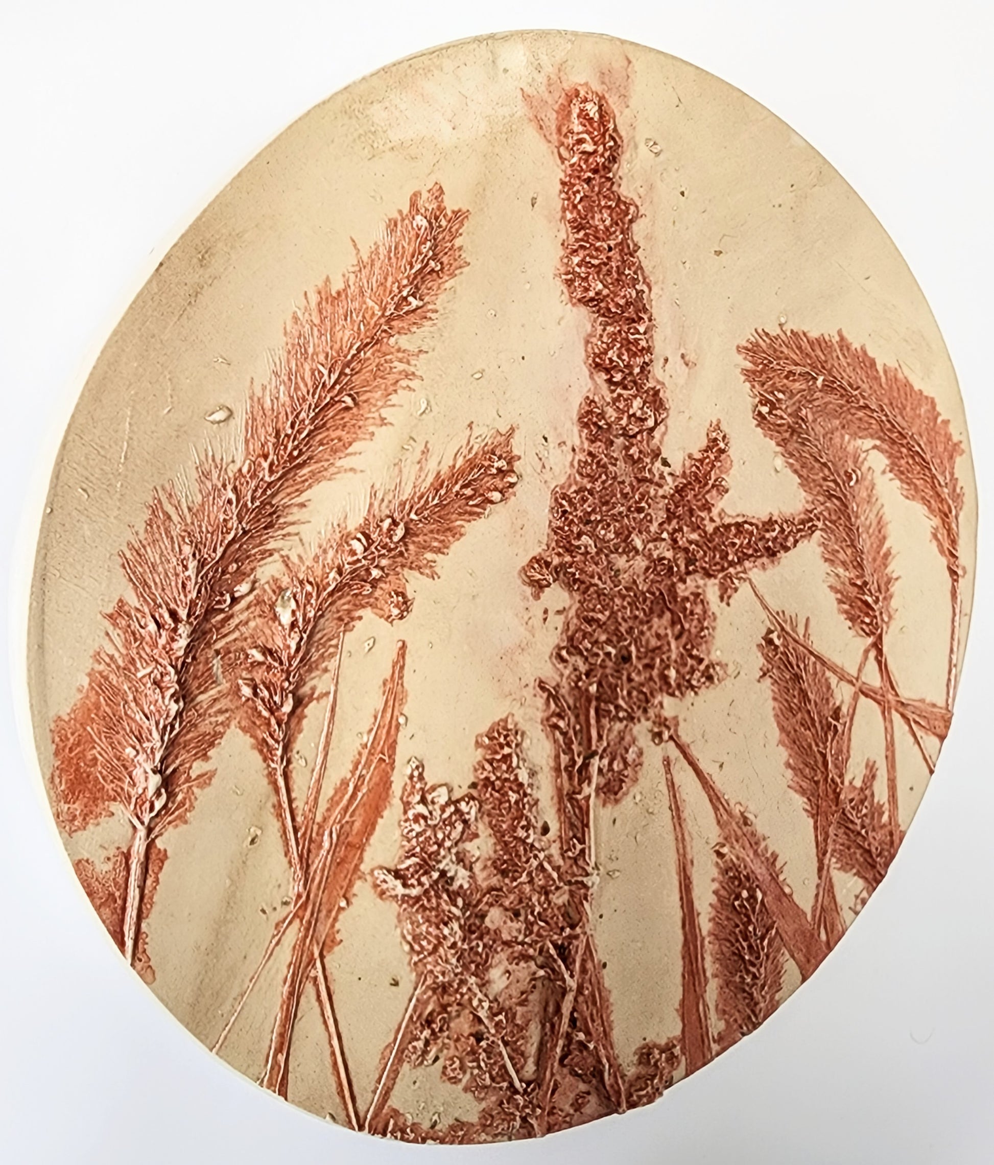 Plaster bas relief cast of foxtail and amaranth seedheads tinted in terracotta on a buff colored background.