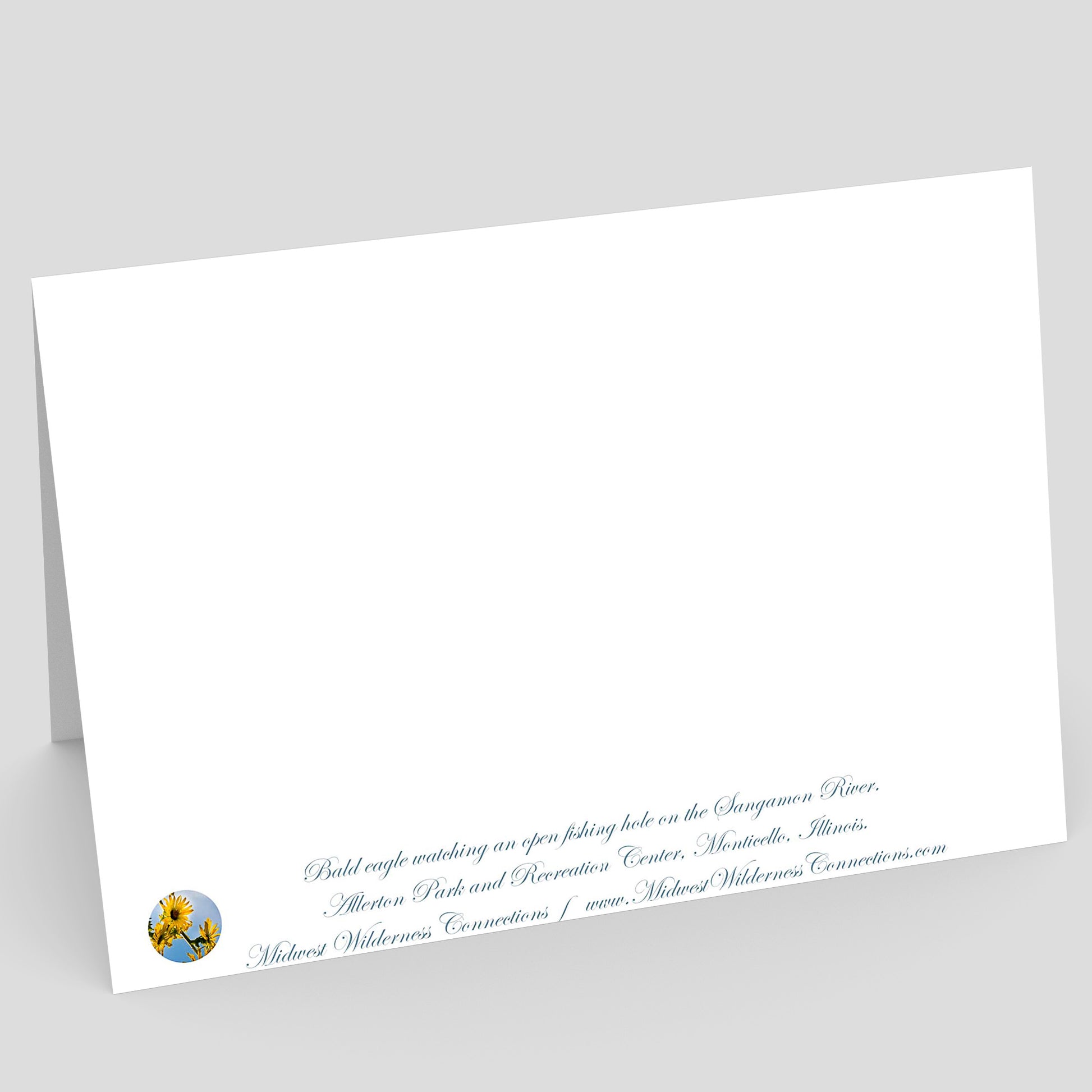 - L'emplacement et la description de la photo, ainsi que le logo et l'adresse du site Web de Midwest Wilderness Connections, sont imprimés le long du bord inférieur du dos de la carte.