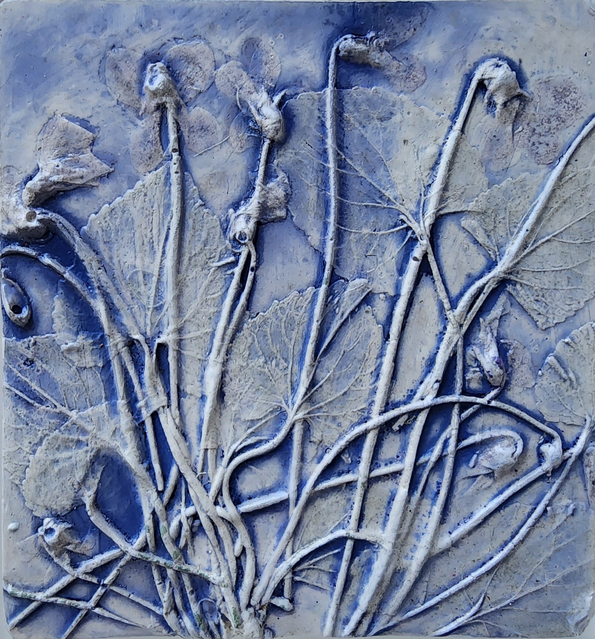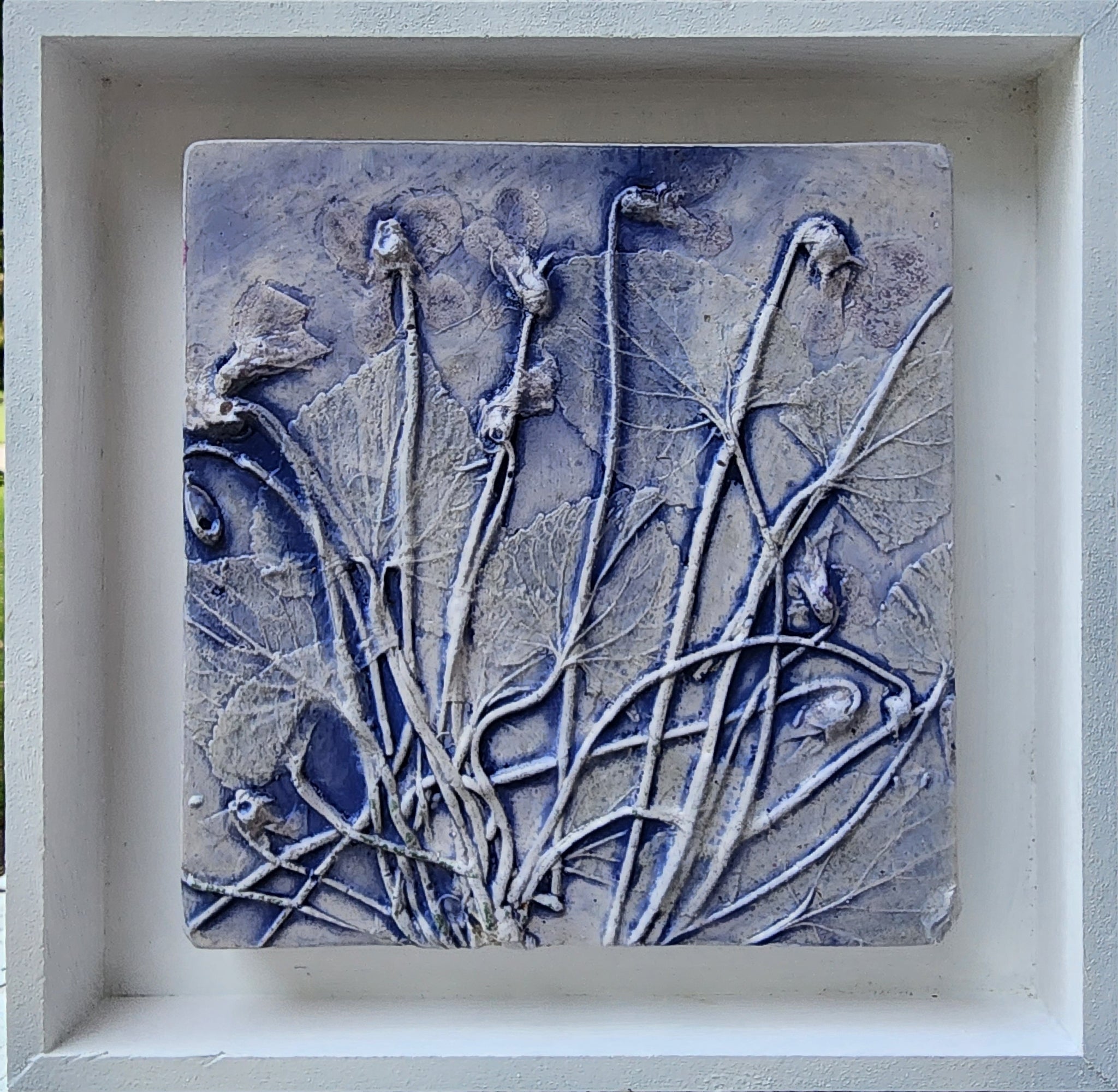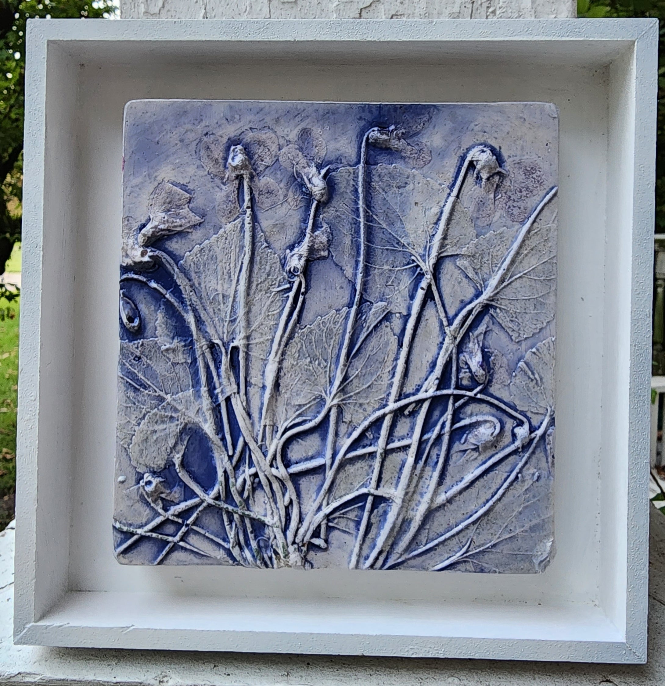 Plaster bas relief cast of real common violets color-washed in blue pigment.