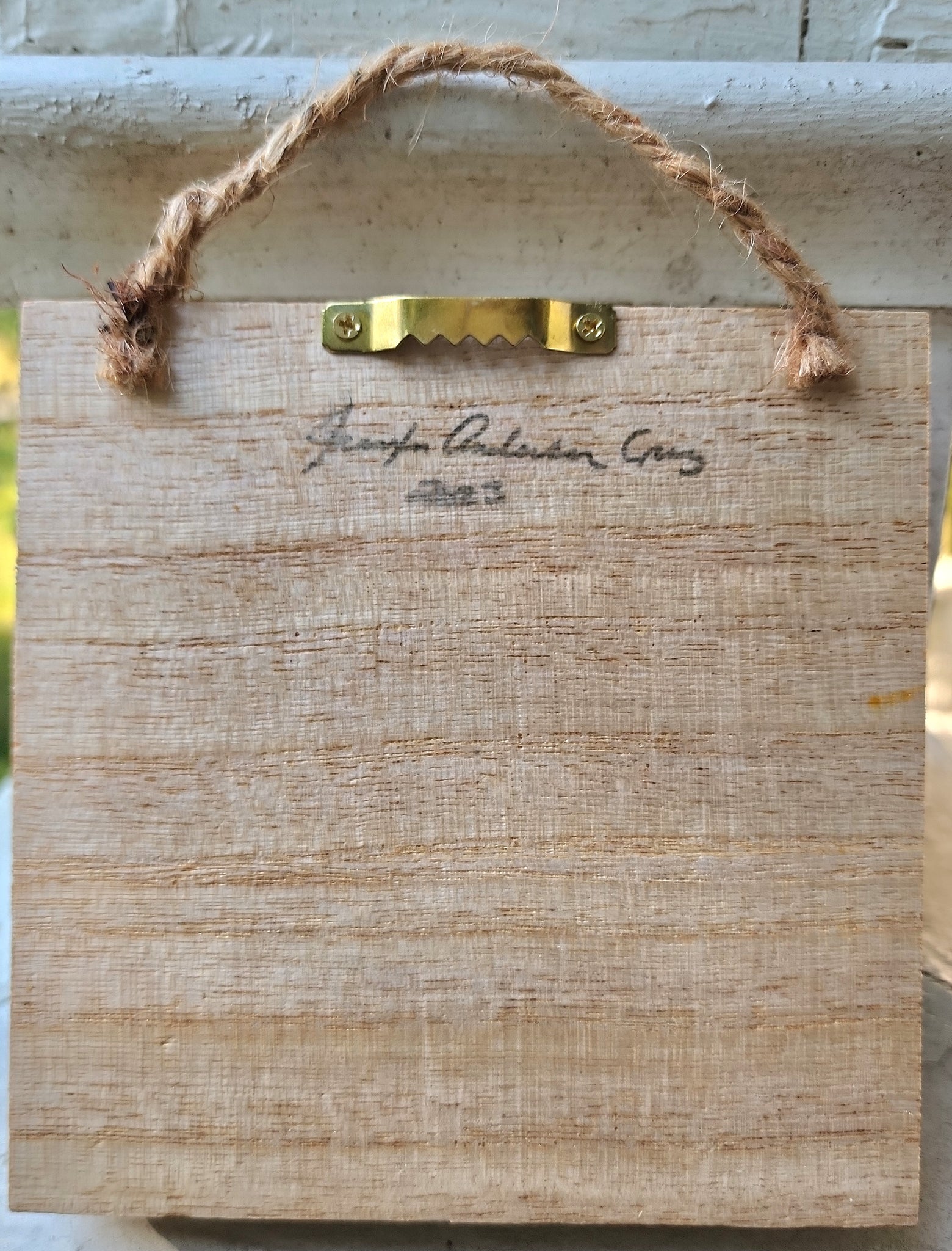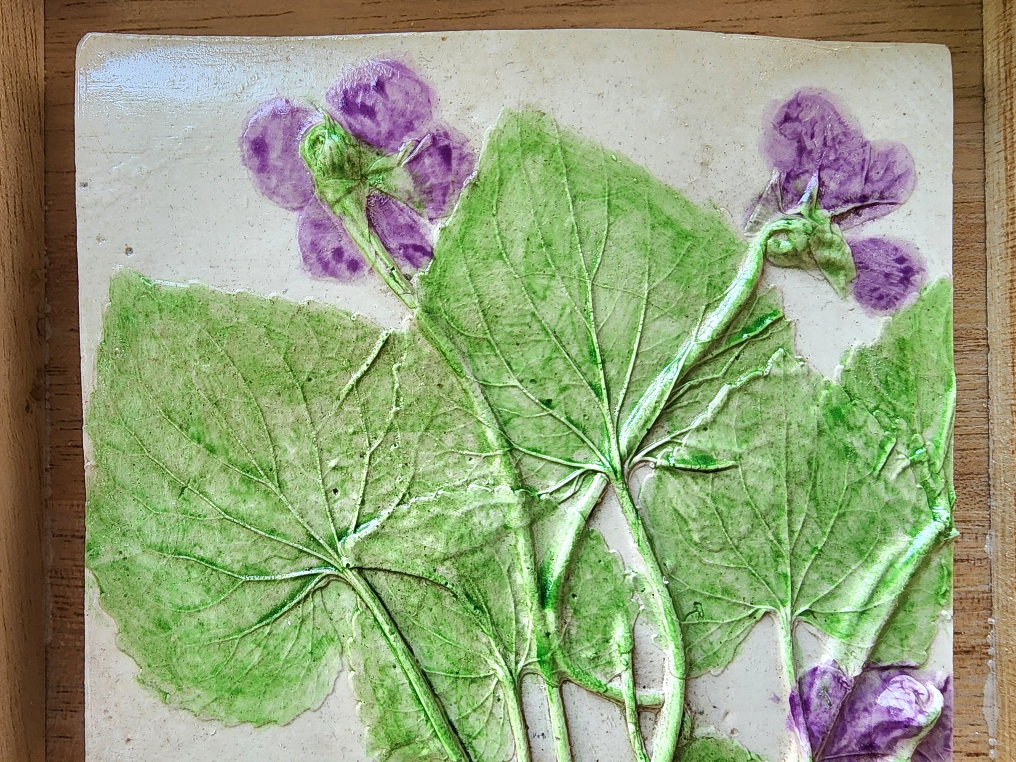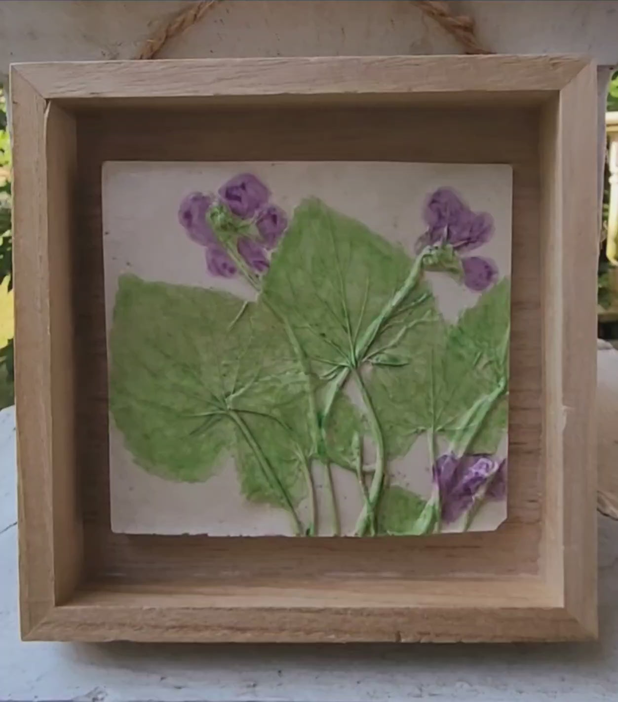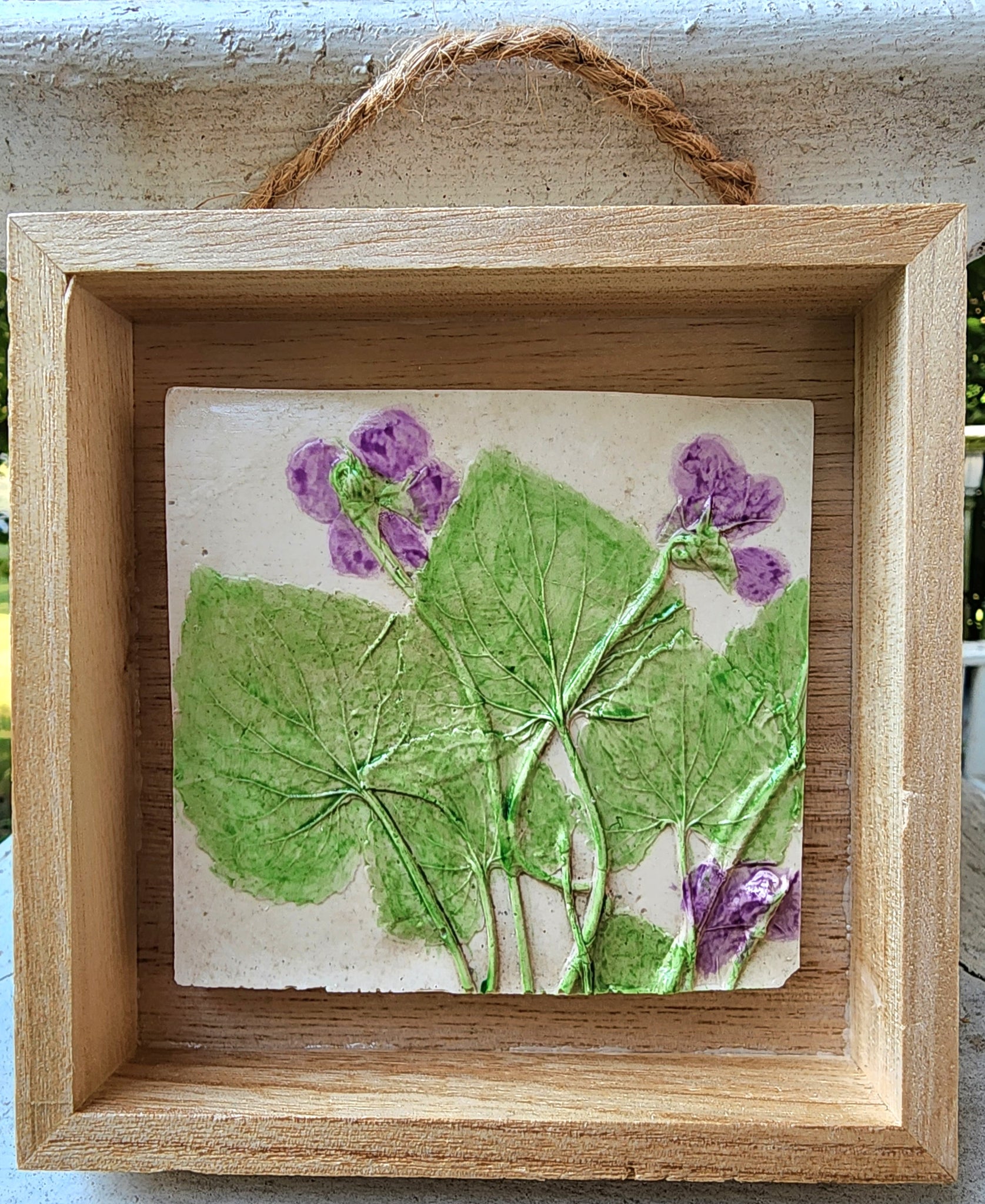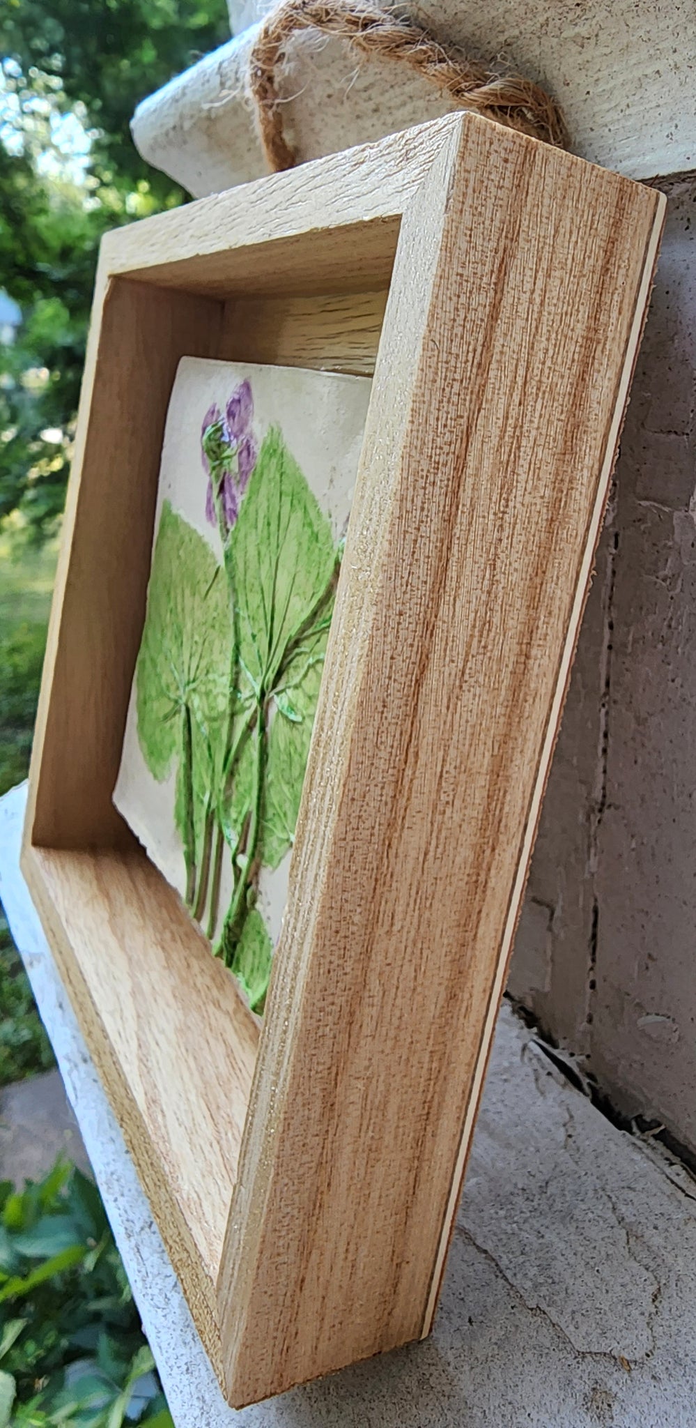 Plaster cast of hand-painted common violets in a 5"W × 5"H x 1"D wooden, shadowbox frame in natural finish. Both the cast and shadowbox are protected with gloss acrylic sealer. For hanging, there is a sawtooth mount and a twine rope on the back.