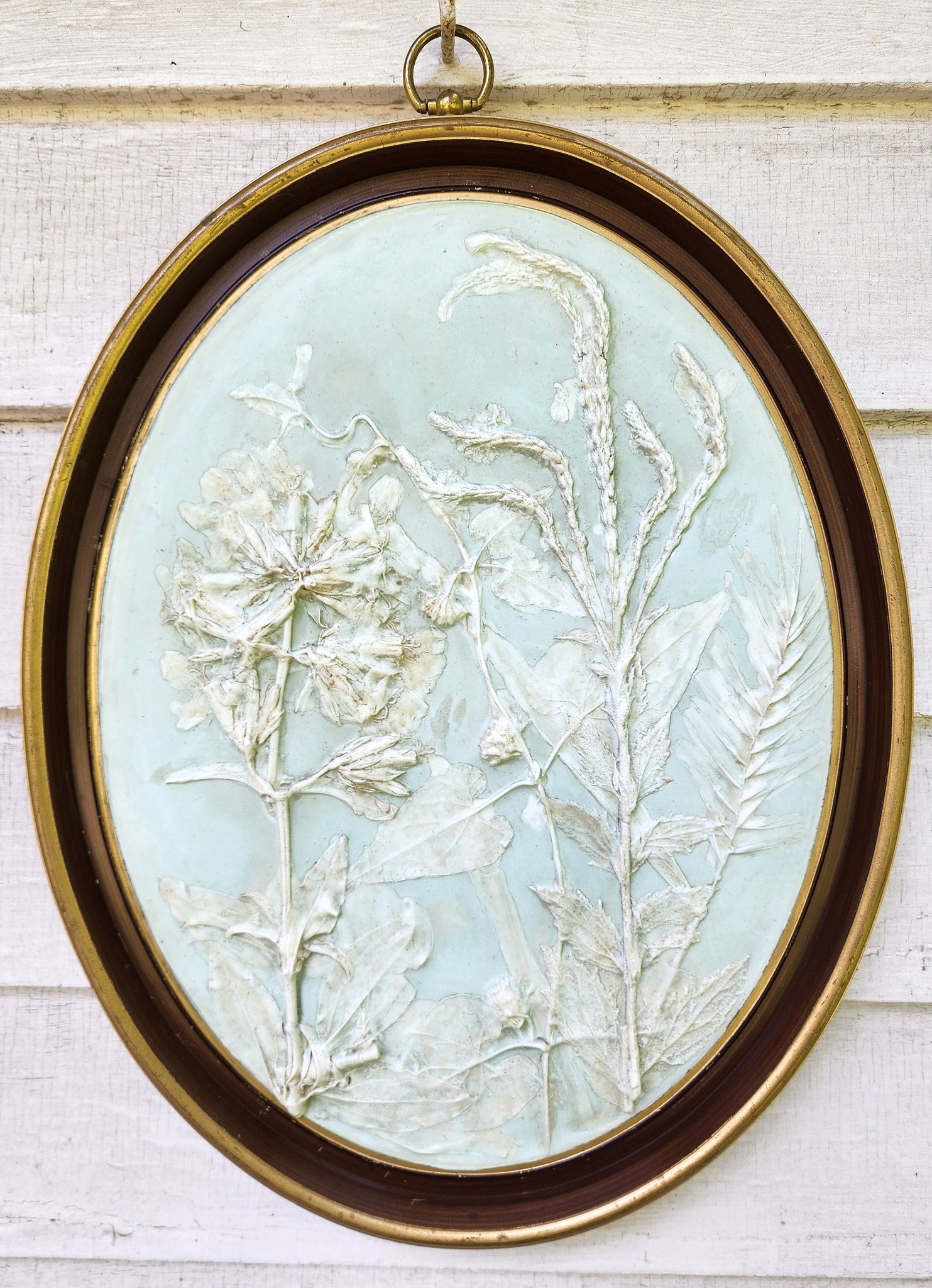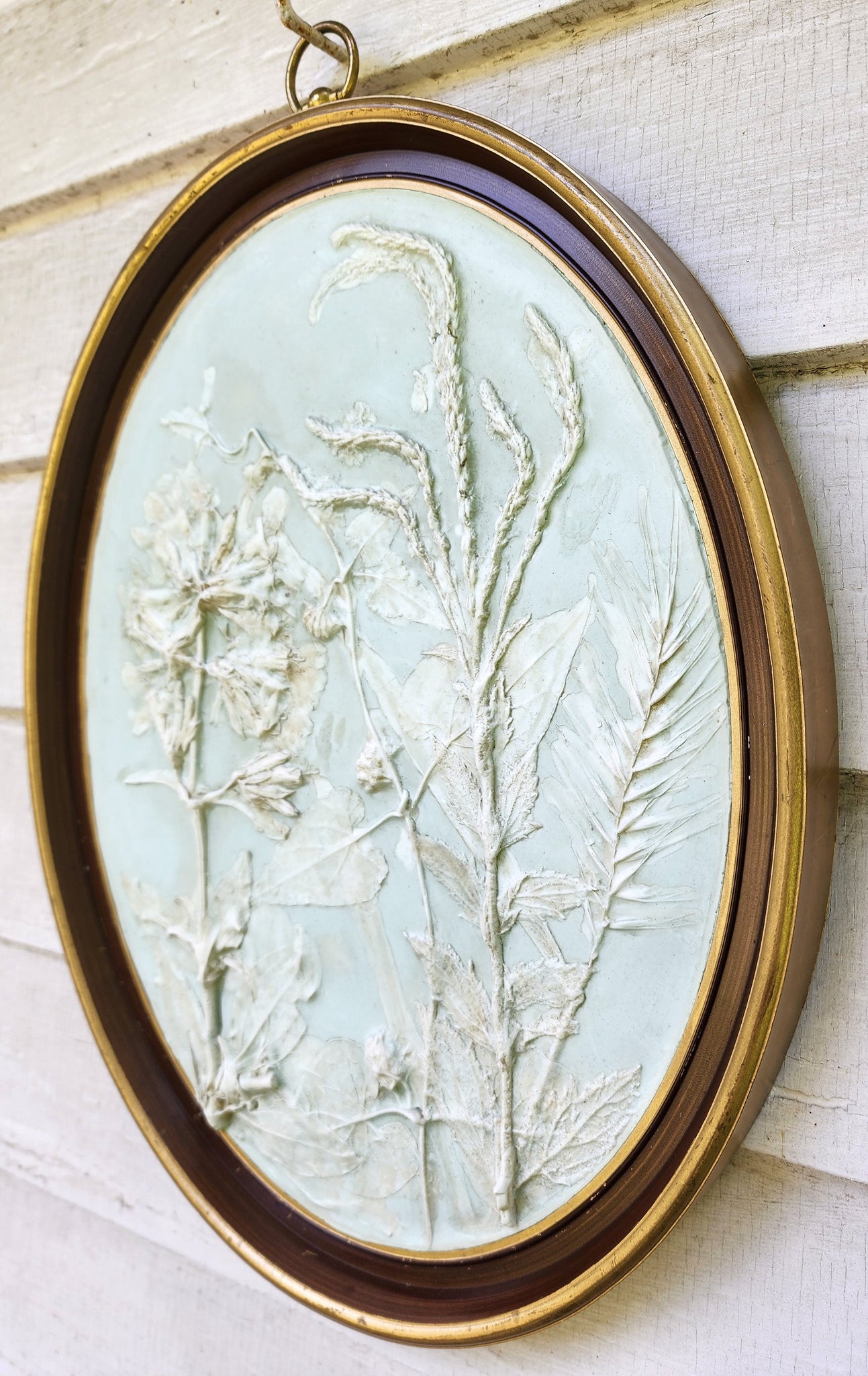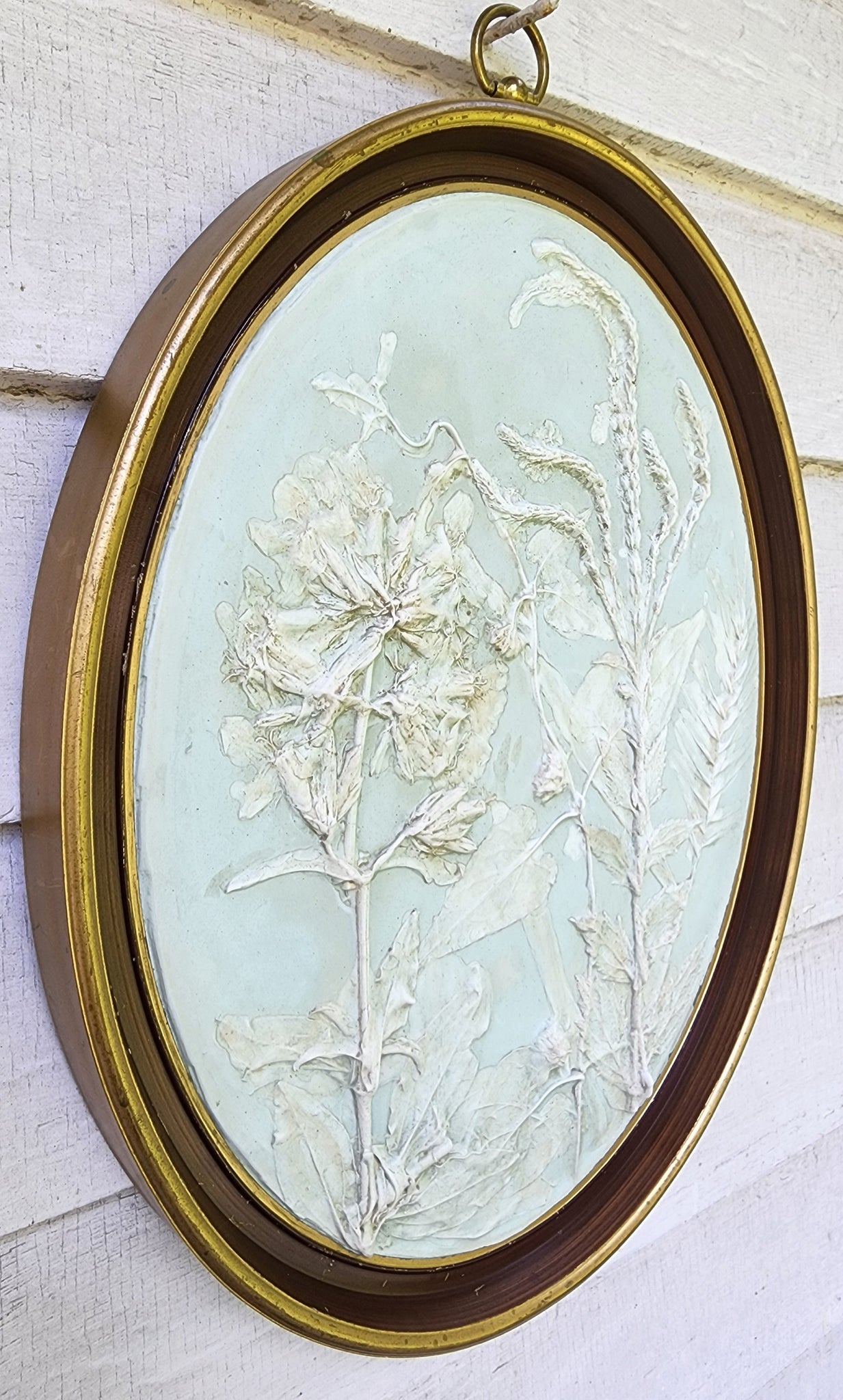 This plaster cast features bas relief of real flowers in white with a beautifully pigmented blue background. The repurposed frame is heavy plastic with a walnut-colored wood finish and gold detailing. The frame has been cleaned and sealed with paste wax to preserve it's vintage patina. There is a decorative brass loop on top of the frame for hanging.