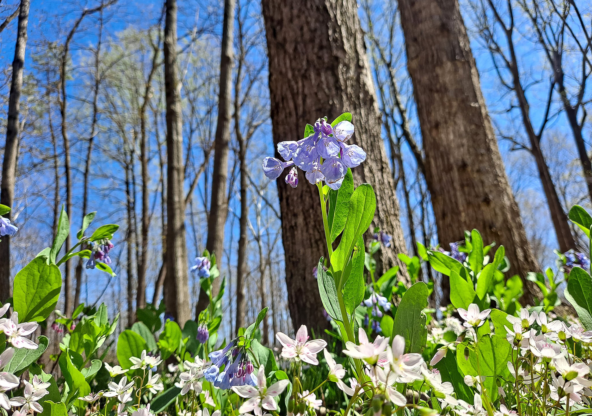 Spring to action with Virginia bluebells (Mertensia virginica) and spring beauty (Claytonia virginica). Lodge Park, Monticello, Illinois, USA.