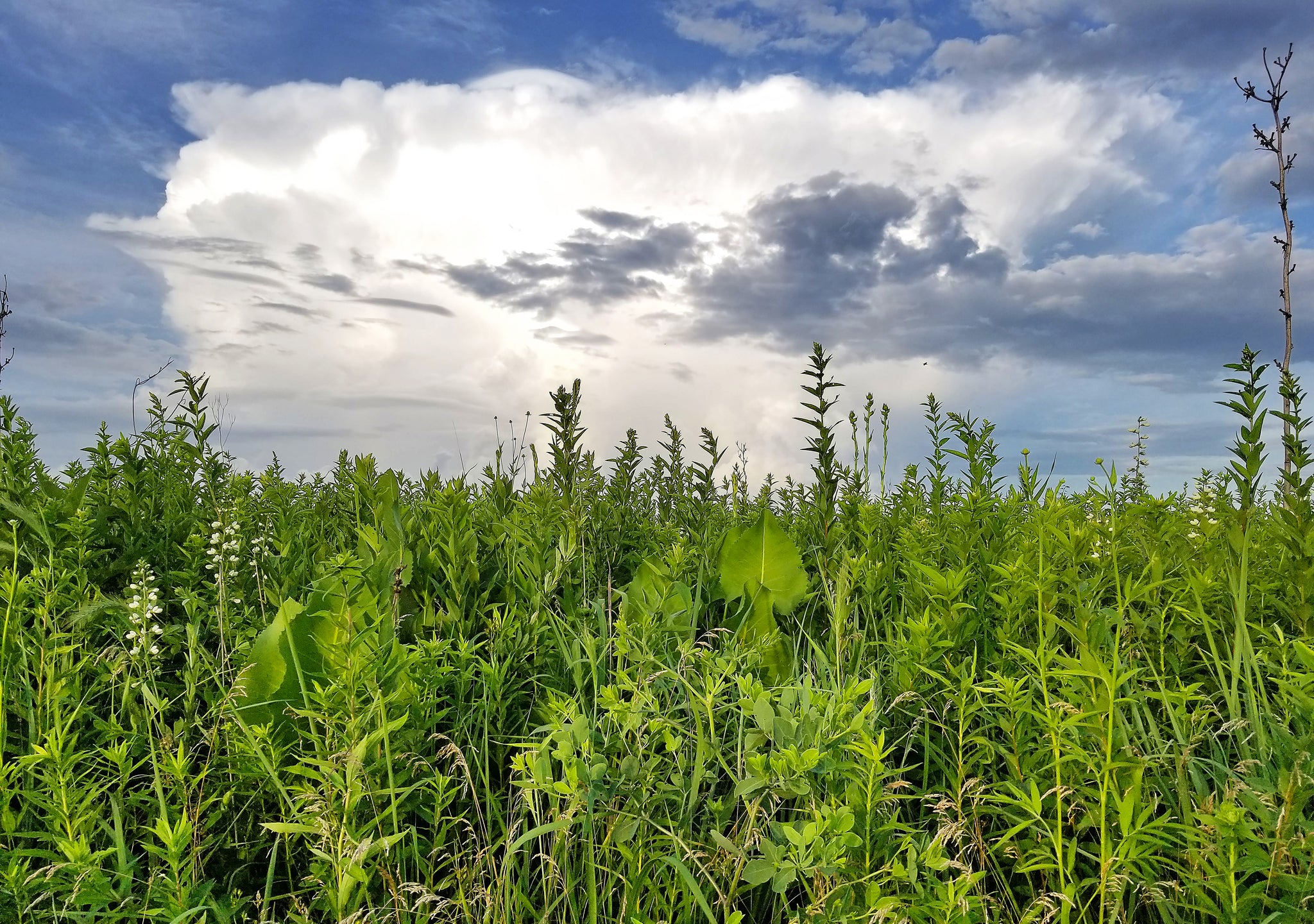 Restored prairie under a stormy sky. Sangamon River Forest Preserve, Fisher, Illinois, USA.
